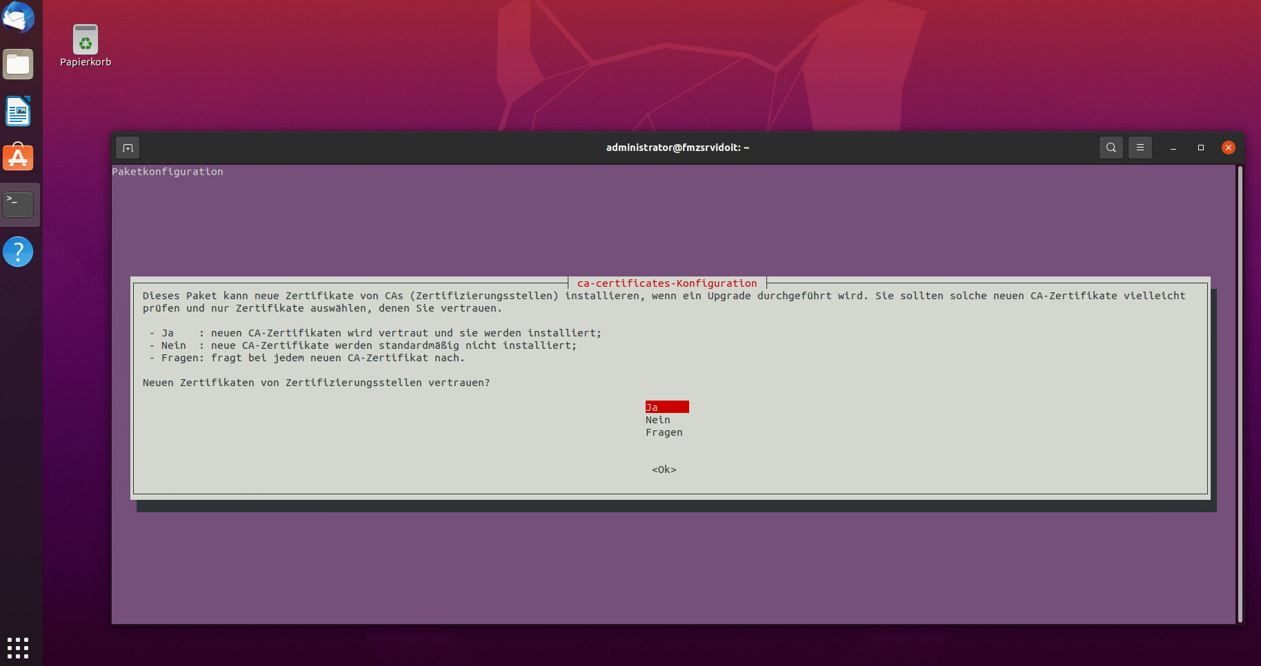 Jetzt die Zertifikatsverwaltung starten: sudo dpkg-reconfigure ca-certificates